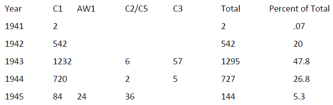Nationally, Liberty Ship production was initiated in late 1941 and continued to the end of WWII in 1945. Production reached its peak in 1943 as the following data indicate: