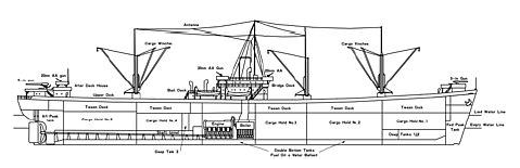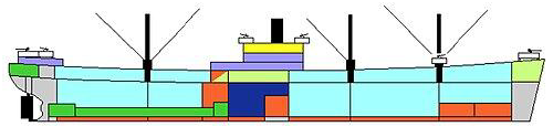 Referring to the colored diagram, the utilization of space in a C1 Liberty Ship was as follows: