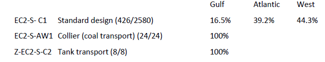 Collectively, the Gulf Coast, Atlantic, and West Coast shipyards produced the following percentages of the various types of Liberty Ships (Gulf Coast/Total):