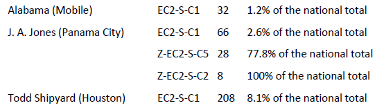 No rationale was found concerning the types of vessels produced at a given yard. However, it is evident that the Gulf Coast shipyards were largely responsible for the production of the non-standard (i.e., ships other than the EC2-S-C1 design) Liberty Ships.